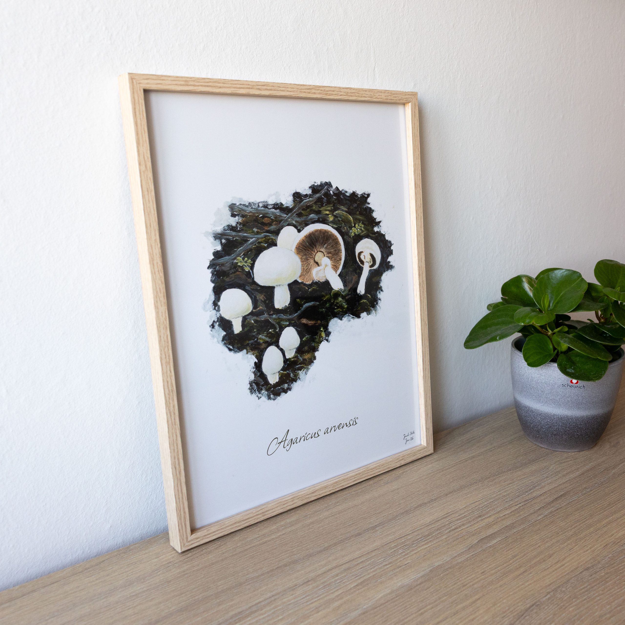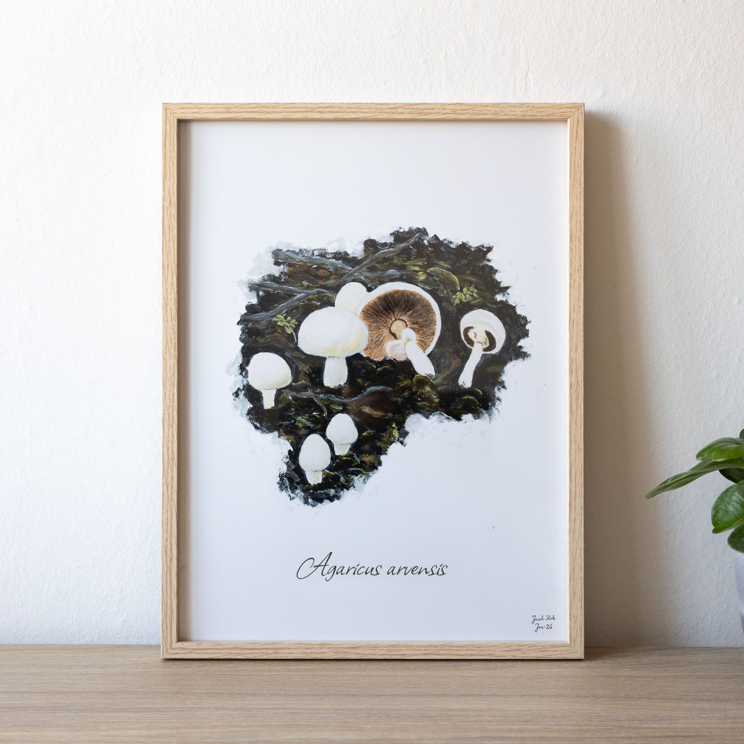 Ager-Champignoner (Agaricus arvensis) 30×40 cm. Plakaten er en del af Skovkær Svampeserie, som består af naturtro illustrationer af svampe fra den danske natur og i alt omfatter 9 udvalgte svampeplakater af spisesvampe, som kan kombineres på tværs.