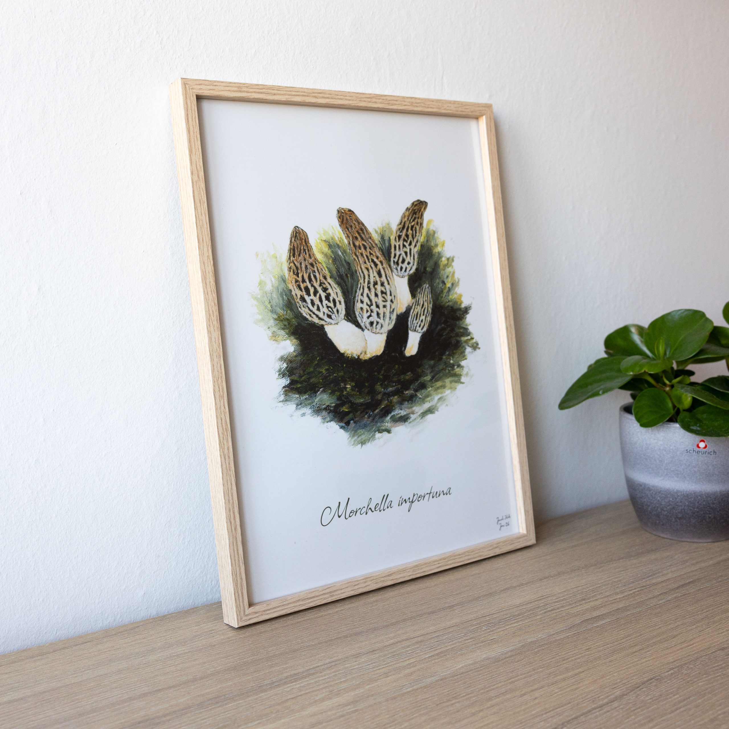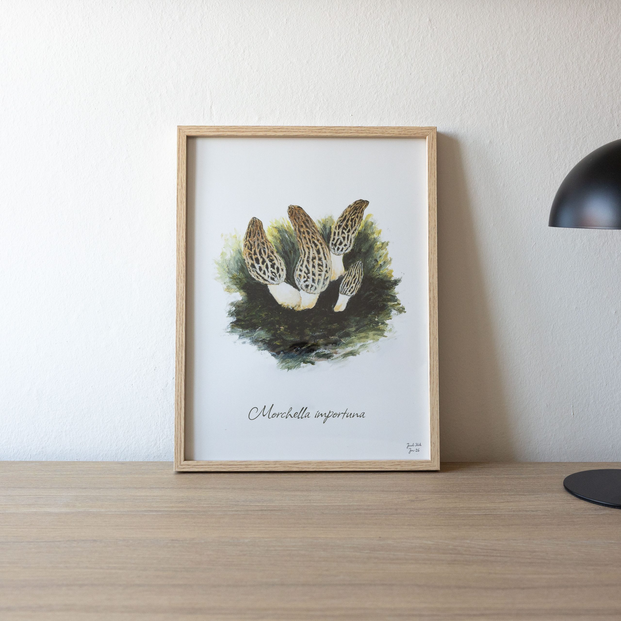 Keglemorkel (Morchella importuna) – svampeplakat på 30×40 cm. Plakaten er en del af Skovkær Svampeserie, som består af naturtro illustrationer af svampe fra den danske natur og i alt omfatter 9 udvalgte svampeplakater af spisesvampe, som kan kombineres på tværs.